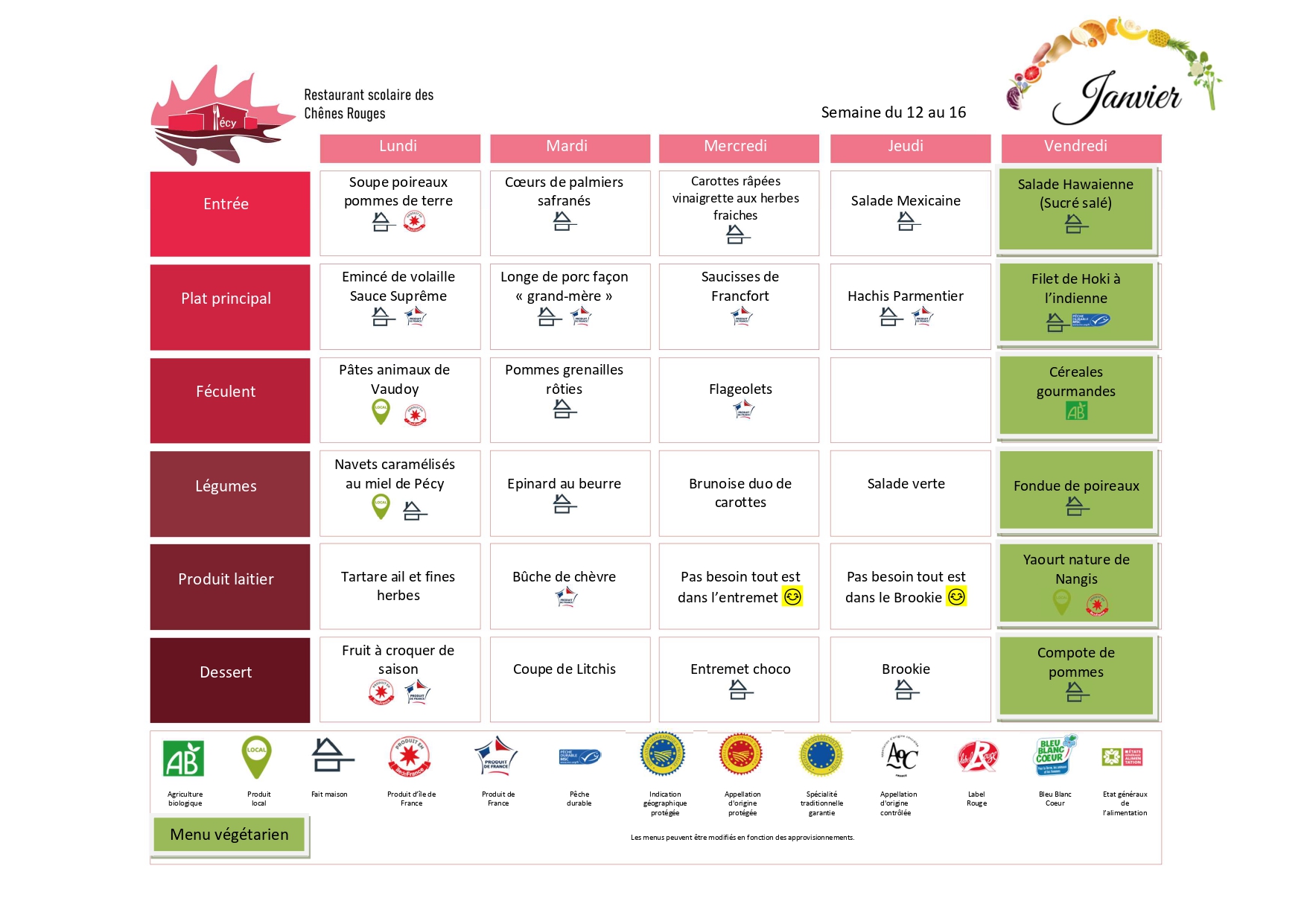MENU DE LA SEMAINE DU 12 AU 16 JANVIER 2026