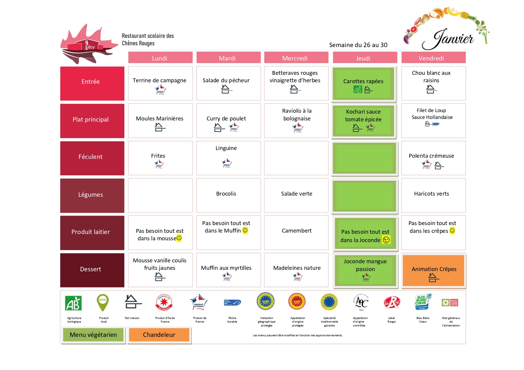 MENU DE LA SEMAINE DU 26 AU 30 JANVIER 2026