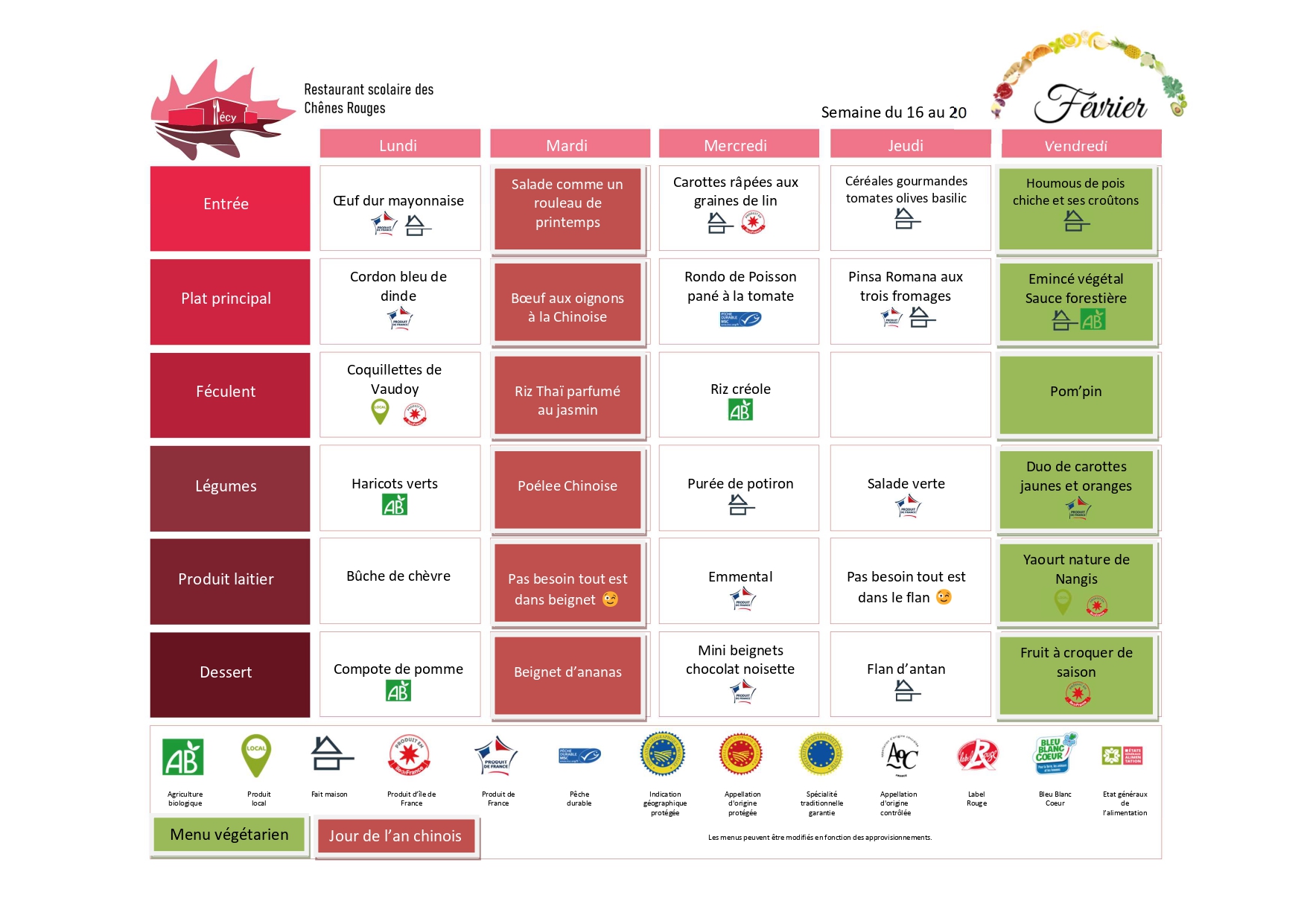 MENU DE LA SEMAINE DU 16 AU 20 FÉVRIER 2026